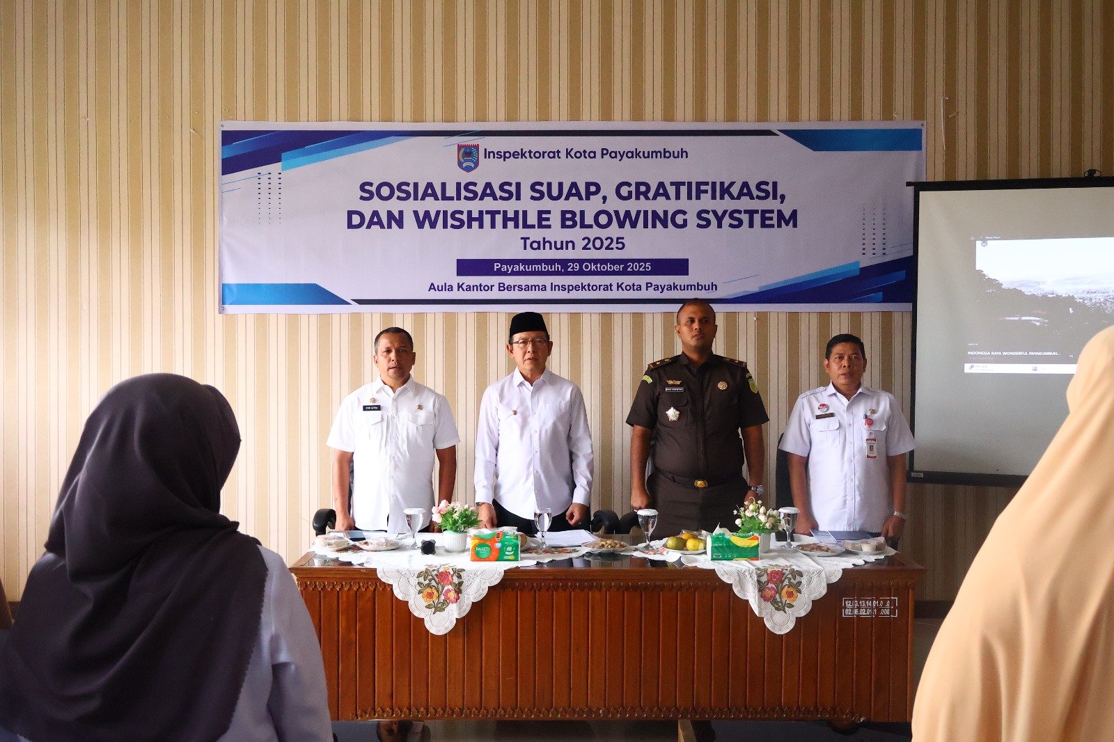 Payakumbuh — Pemko Payakumbuh terus memperkuat langkah pencegahan korupsi dengan menyelenggarakan Sosialisasi Suap, Gratifikasi, dan Aplikasi Whistle Blowing System (WBS) di Aula Bersama Inspektorat Kota Payakumbuh, Rabu (29/10/2025).