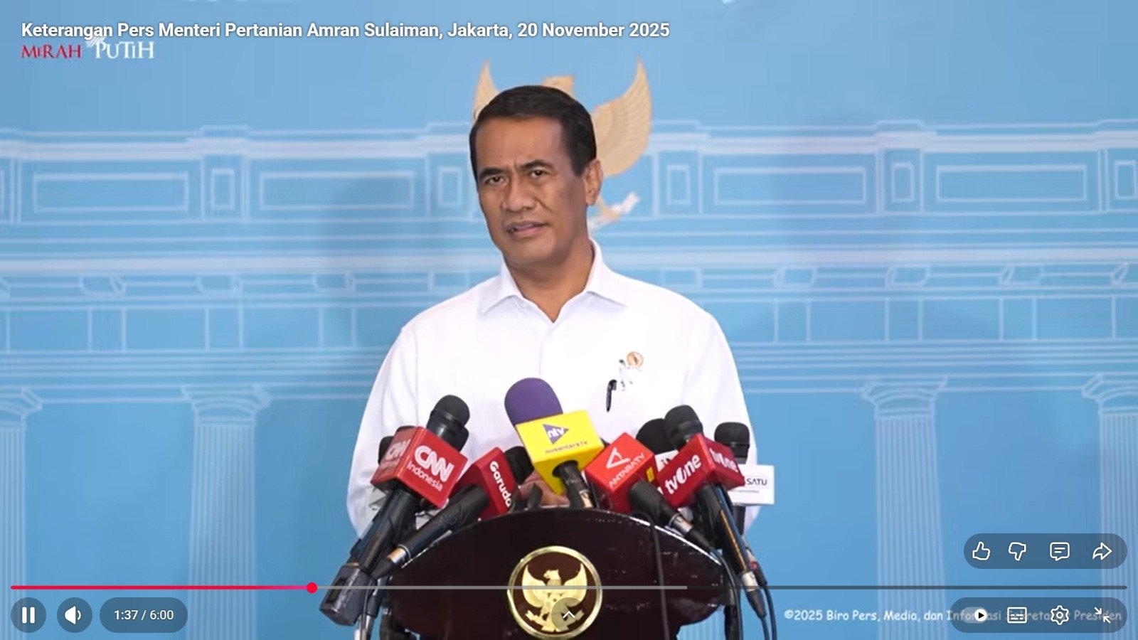 Jakarta— Presiden Prabowo Subianto mengadakan rapat terbatas (ratas) dengan sejumlah menteri Kabinet Merah Putih di Istana Merdeka, Jakarta, pada Kamis, 20 November 2025. Dalam keterangannya kepada awak media usai ratas, Menteri Pertanian Amran Sulaiman menyampaikan hasil ratas terkait perkembangan ketahanan pangan nasional dan sejumlah capaian serta rencana strategis sektor pangan dan peternakan.