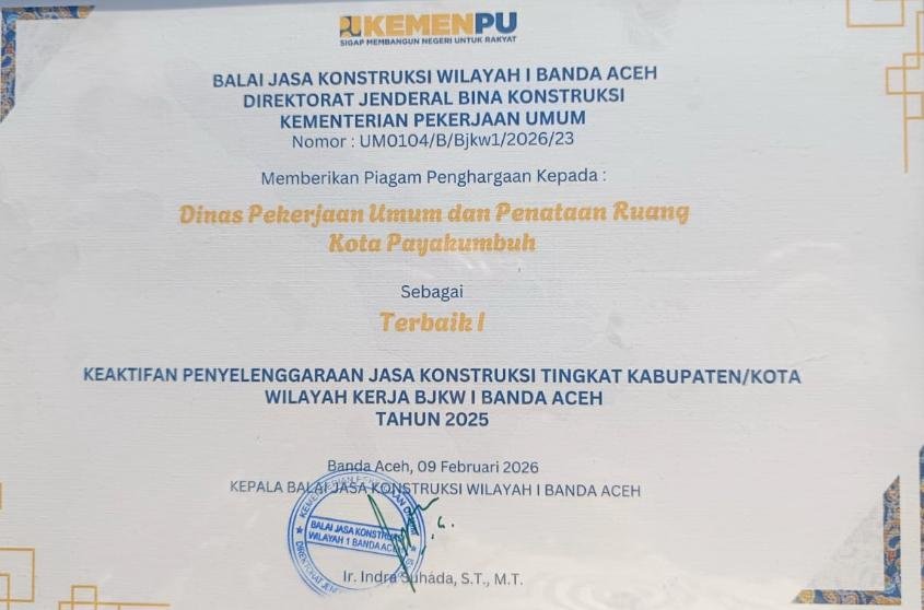 Payakumbuh — Dinas Pekerjaan Umum dan Penataan Ruang (PUPR) Kota Payakumbuh meraih Penghargaan Terbaik I pada Penilaian Kinerja dan Pembinaan OPD Sub-Urusan Jasa Konstruksi di wilayah kerja Balai Jasa Konstruksi Wilayah I Banda Aceh, Senin (09/02/2026).